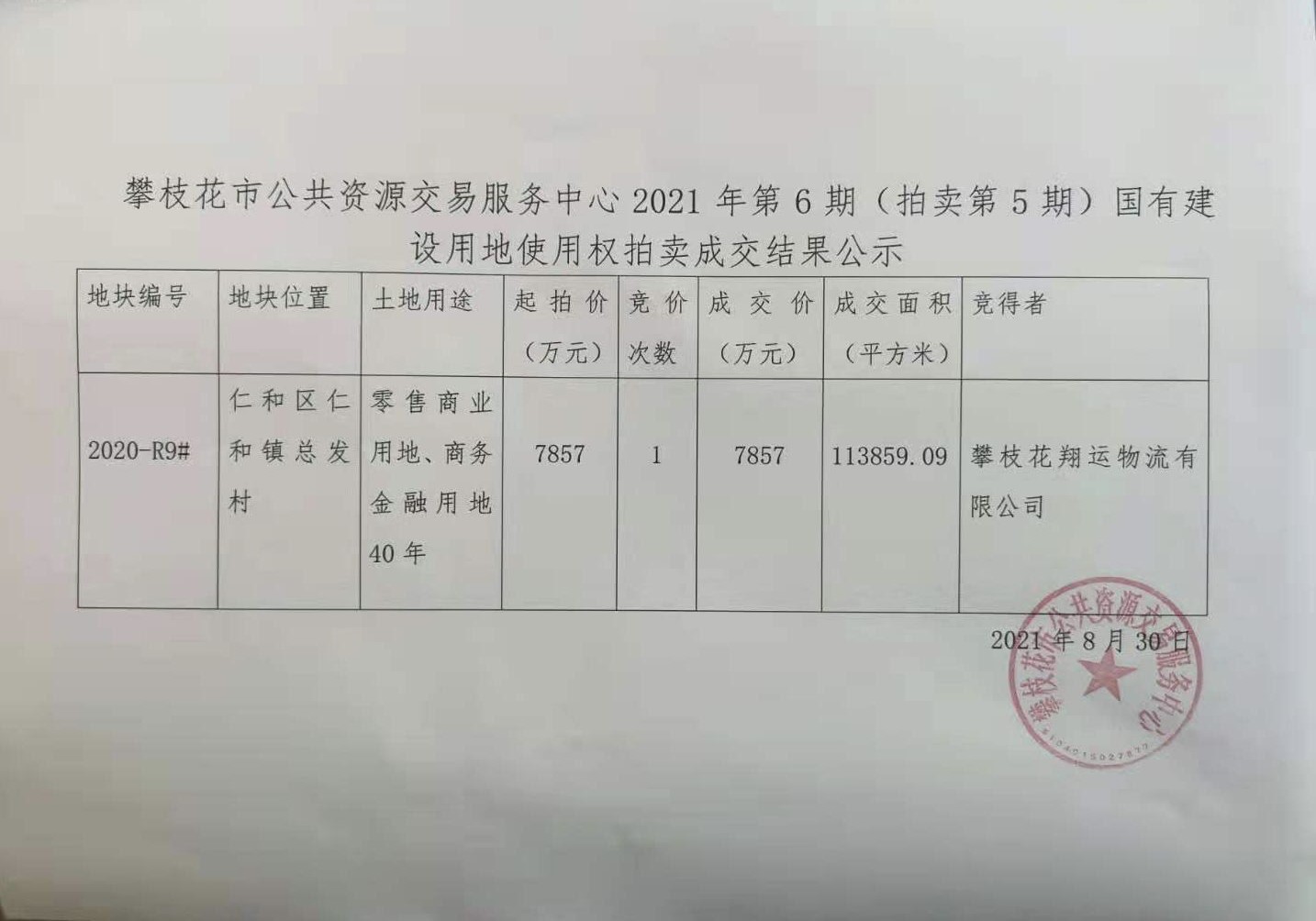 攀枝花市公共资源交易服务中心2021年第6期(拍卖第5期)国有建设用地使用权拍卖成交结果公示