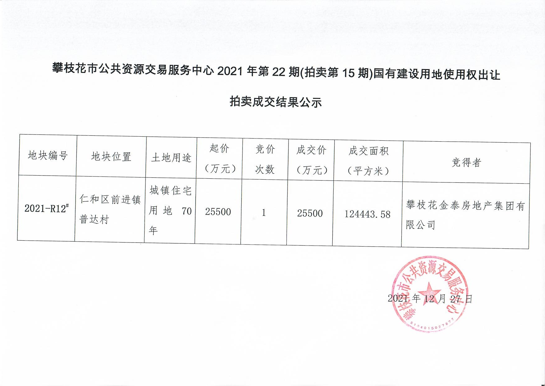 攀枝花市公共资源交易服务中心2021年第22期(拍卖第15期)国有建设用地使用权出让拍卖成交结果公示