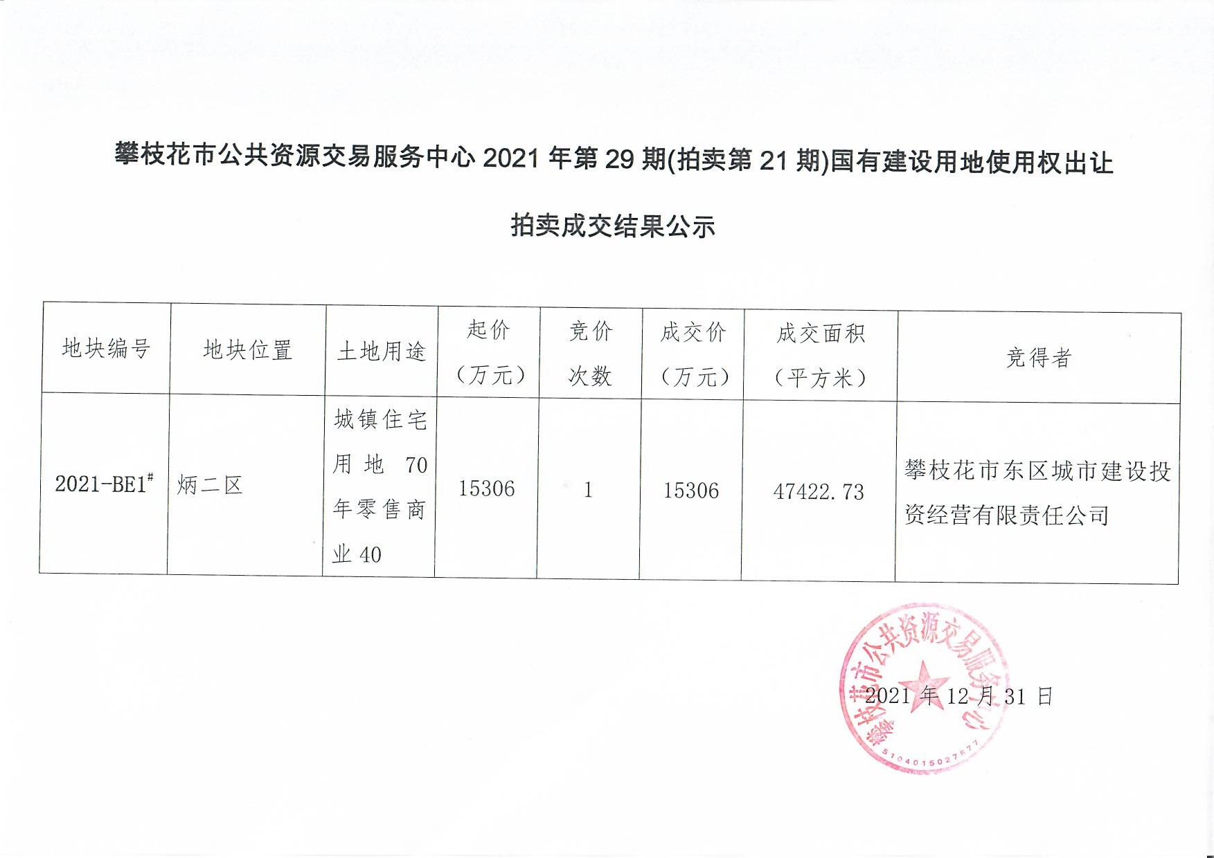 攀枝花市公共资源交易服务中心2021年第29期(拍卖第21期)国有建设用地使用权出让拍卖成交结果公示
