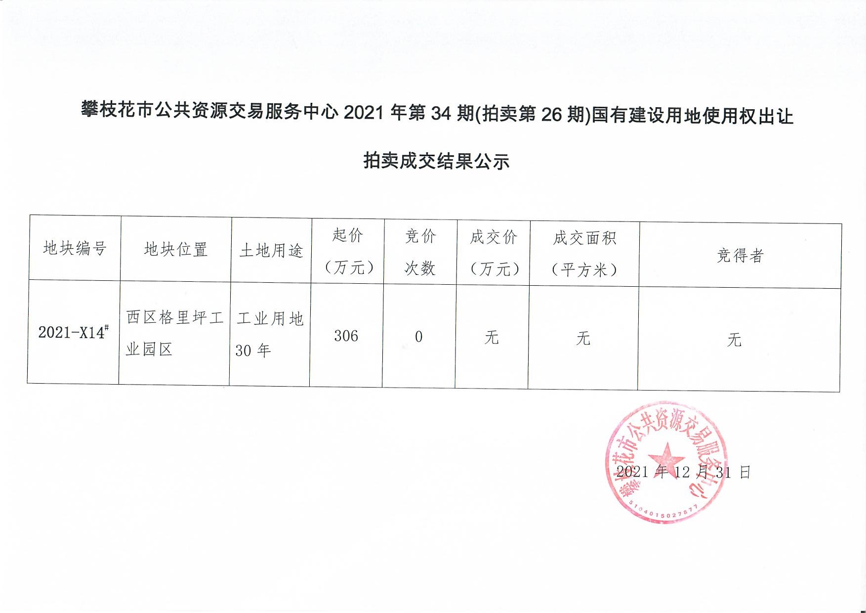 攀枝花市公共资源交易服务中心2021年第34期(拍卖第26期)国有建设用地使用权出让拍卖成交结果公示