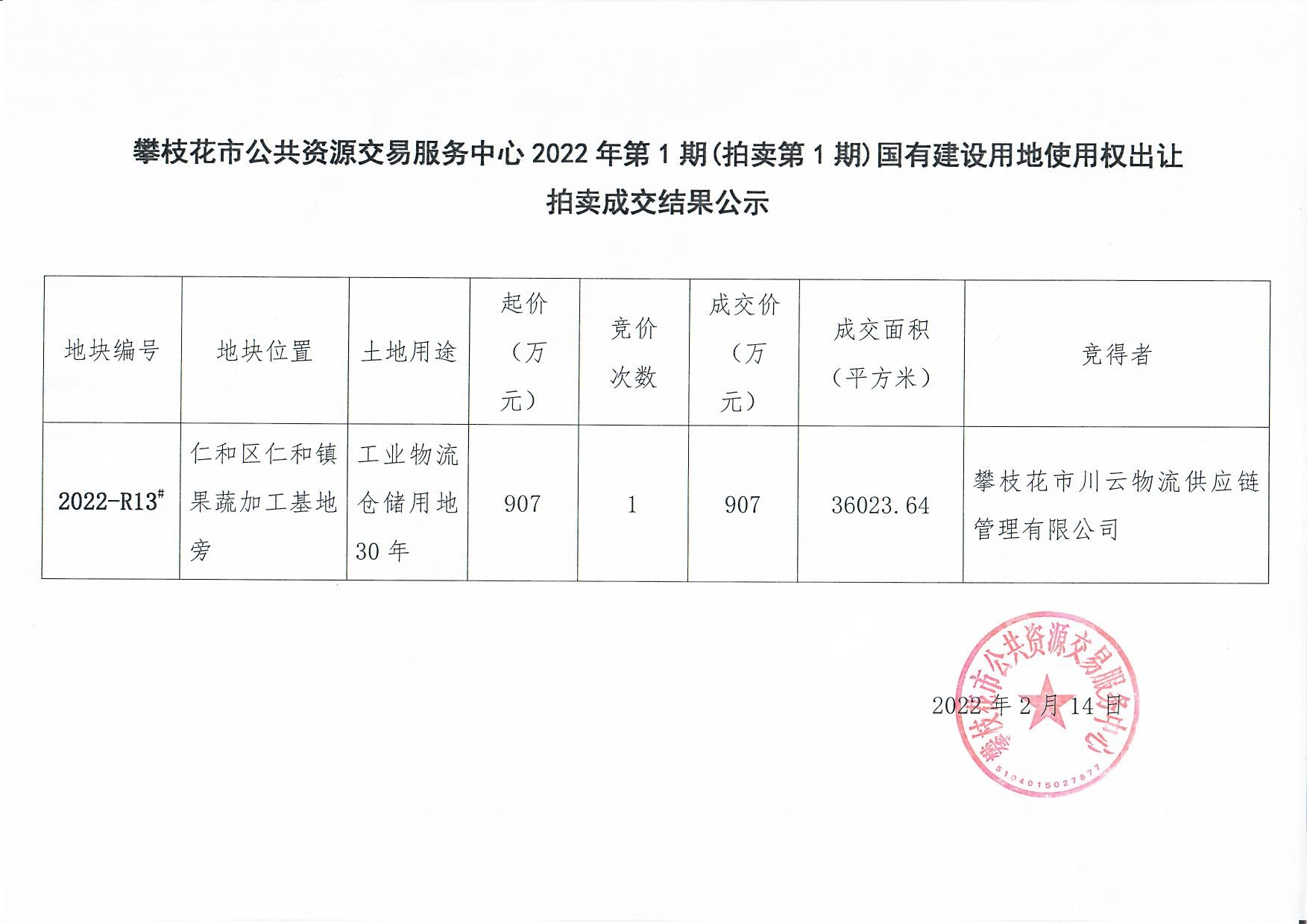 攀枝花市公共资源交易服务中心2022年第1期(拍卖第1期)国有建设用地使用权出让拍卖成交结果公示