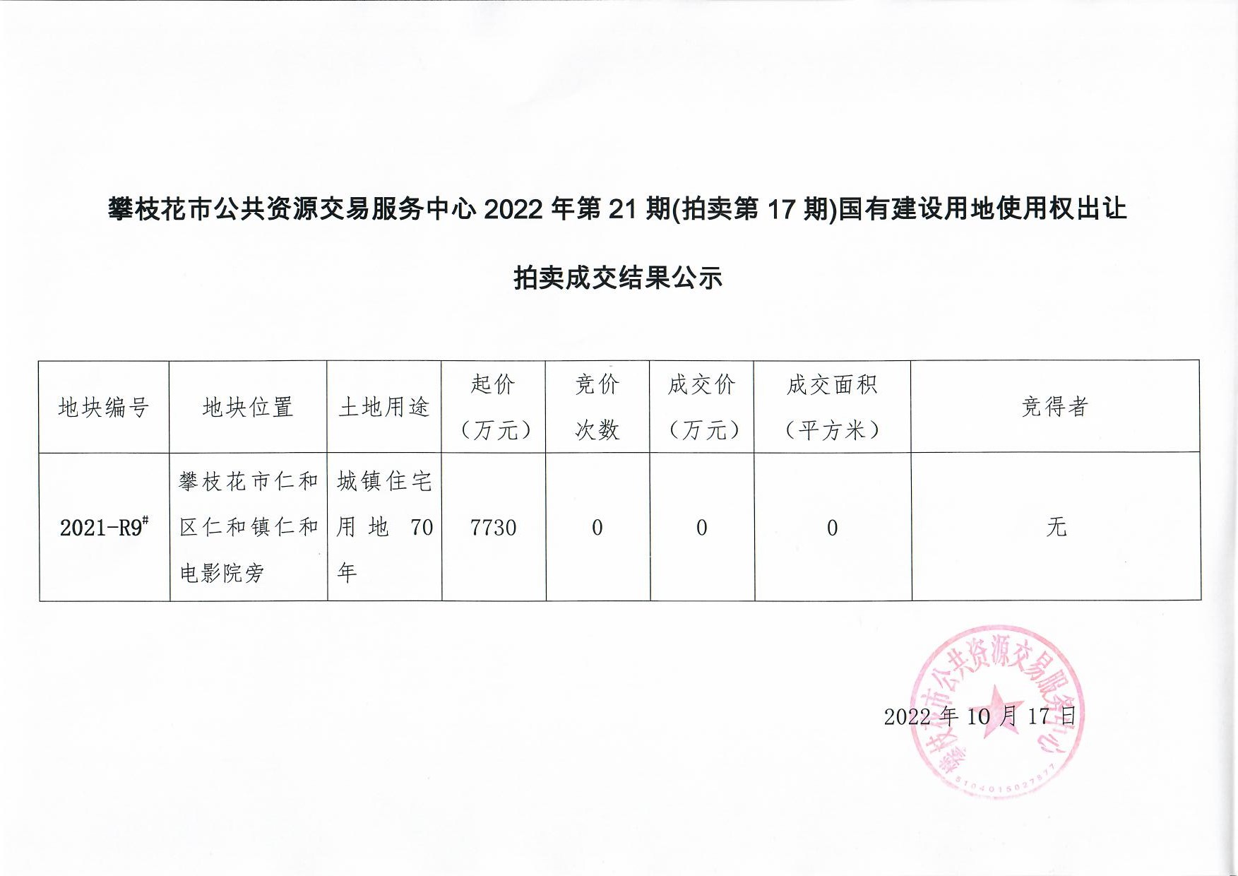 攀枝花市公共资源交易服务中心2022年第21期(拍卖第17期)国有建设用地使用权出让拍卖成交结果公示