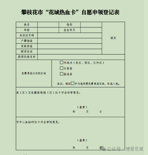 ①信息登记:自愿申领的朋友,持本人有效身份证件和近期2寸免冠电子照片,到市中心血站、市红十字会,或各县(区)卫生健康局、各县(区)红十字会填写《自愿申领登记表》,提交资料(产生的工本费10元/人由持卡人承担);