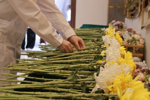 全体人员在志愿者引导下,依次前往纪念园敬献鲜花,寄托哀思。
